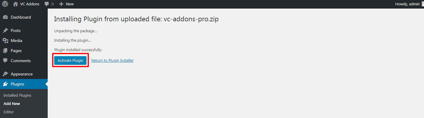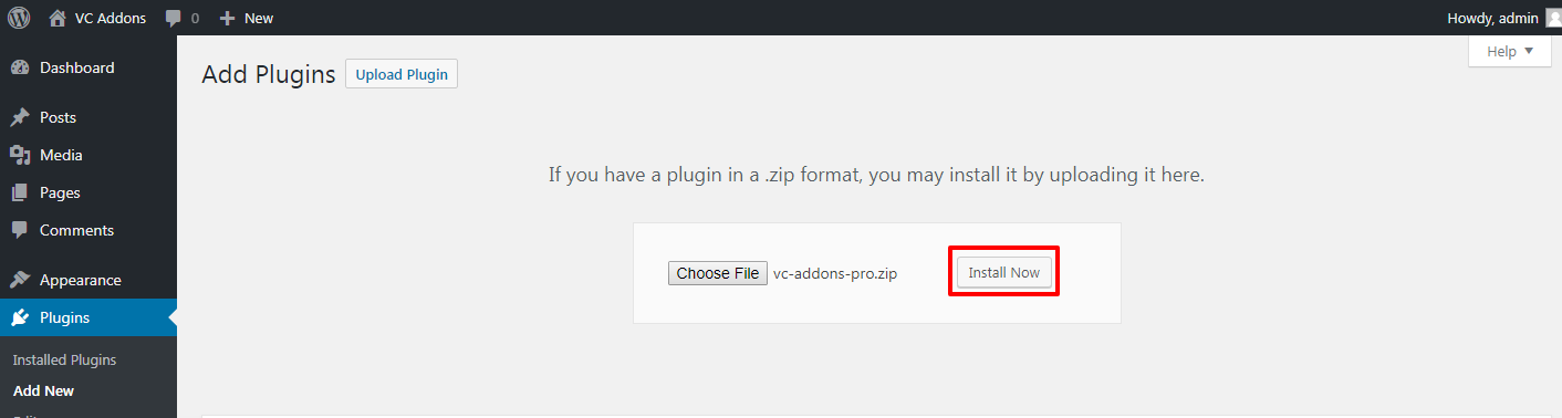 Go to your WP admin -> Plugins -> Add New -> Upload Plugin –> Choose file and select PageBuilderAddons.zip then click on install now. After Successfully installed Activate it.