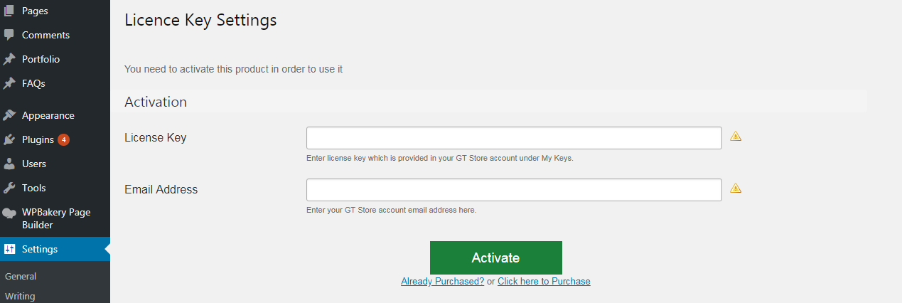 In order to activate, you need to fill the licence key and email address fields that were provided to at the time when you bought the Page Builder Addons for WpBakery